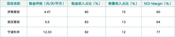 租金坪效已经达到成熟期标准,宁波杉井奥特莱斯尤为突出,NOI Margin(净营业收入边际,也即净营业收入与重资产占比,反映运营效率,高值在65-80%)也全部在60%以上。